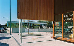Die Kindertagesstätten sind aus dem Wettbewerb "Kitas in Systembauweise" hervorgegangen. Die schlichte zweigeschossige 'Holzbox' wird durch gezielte Eingriffe als Gebäude mit öffentlicher Bedeutung charakterisiert. Die Tragkonstruktion ist in Holzrahmenbauweise mit tragender Beplankung ausgeführt.